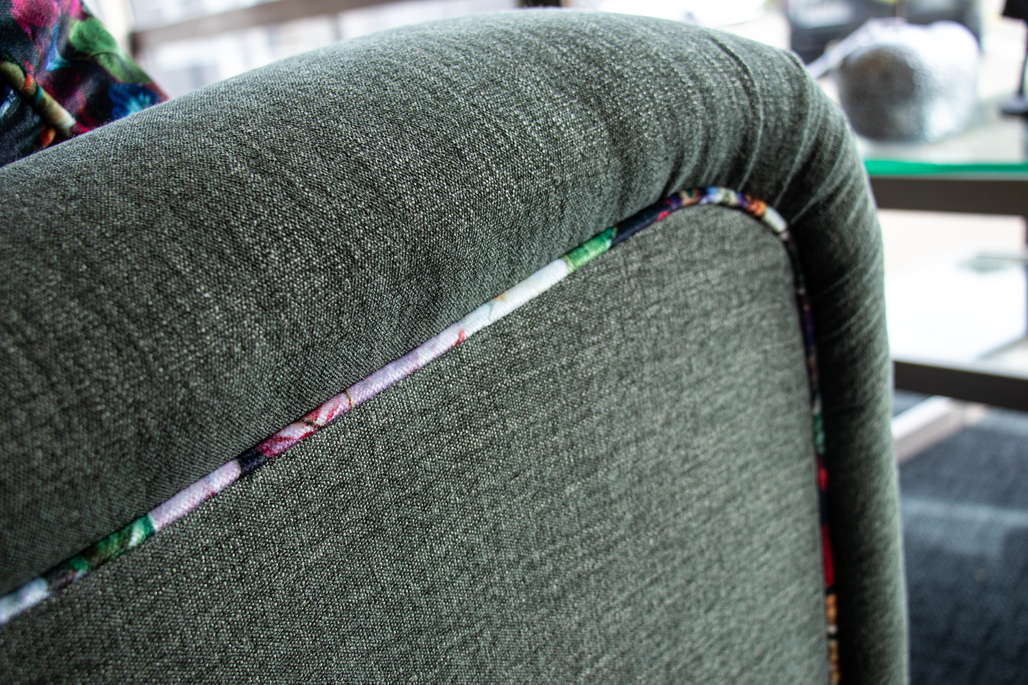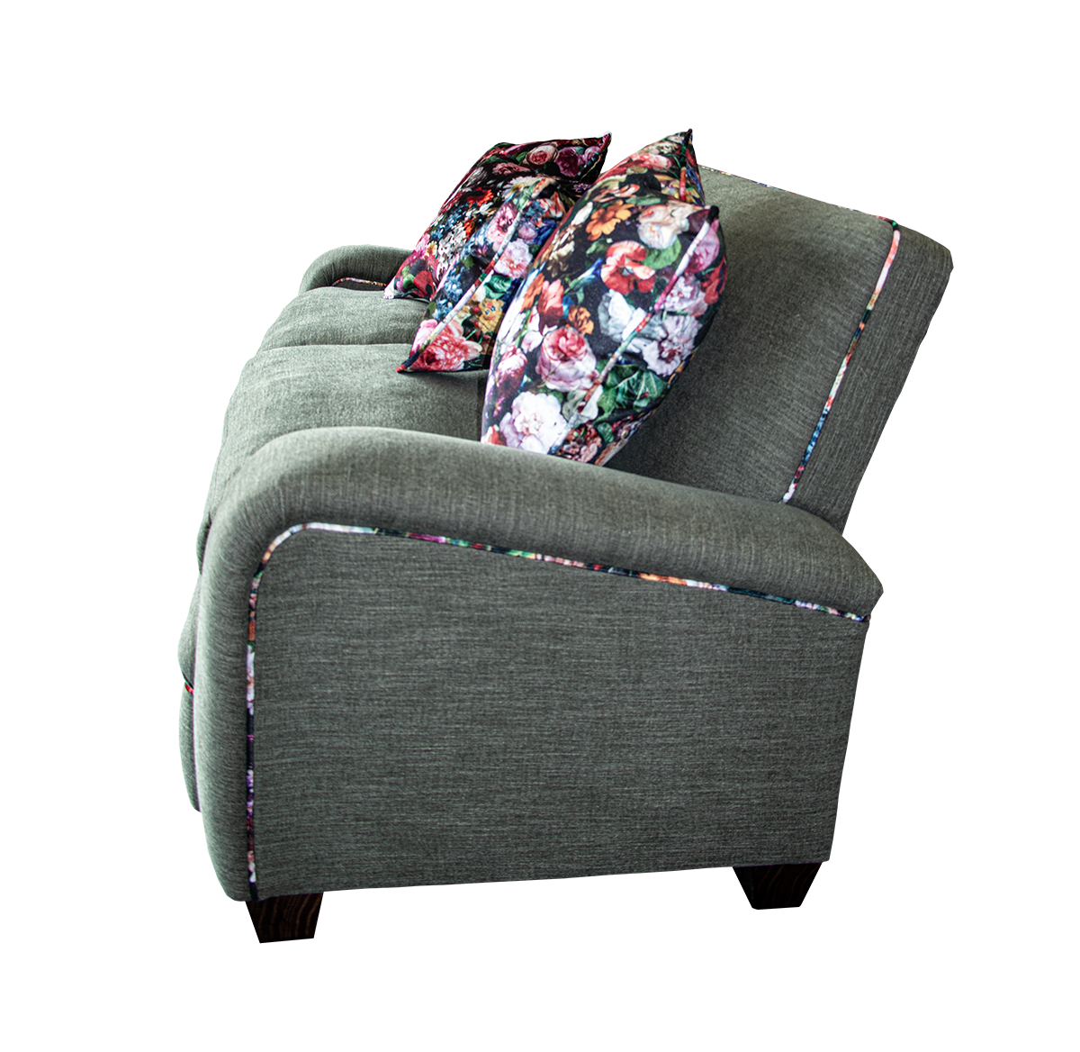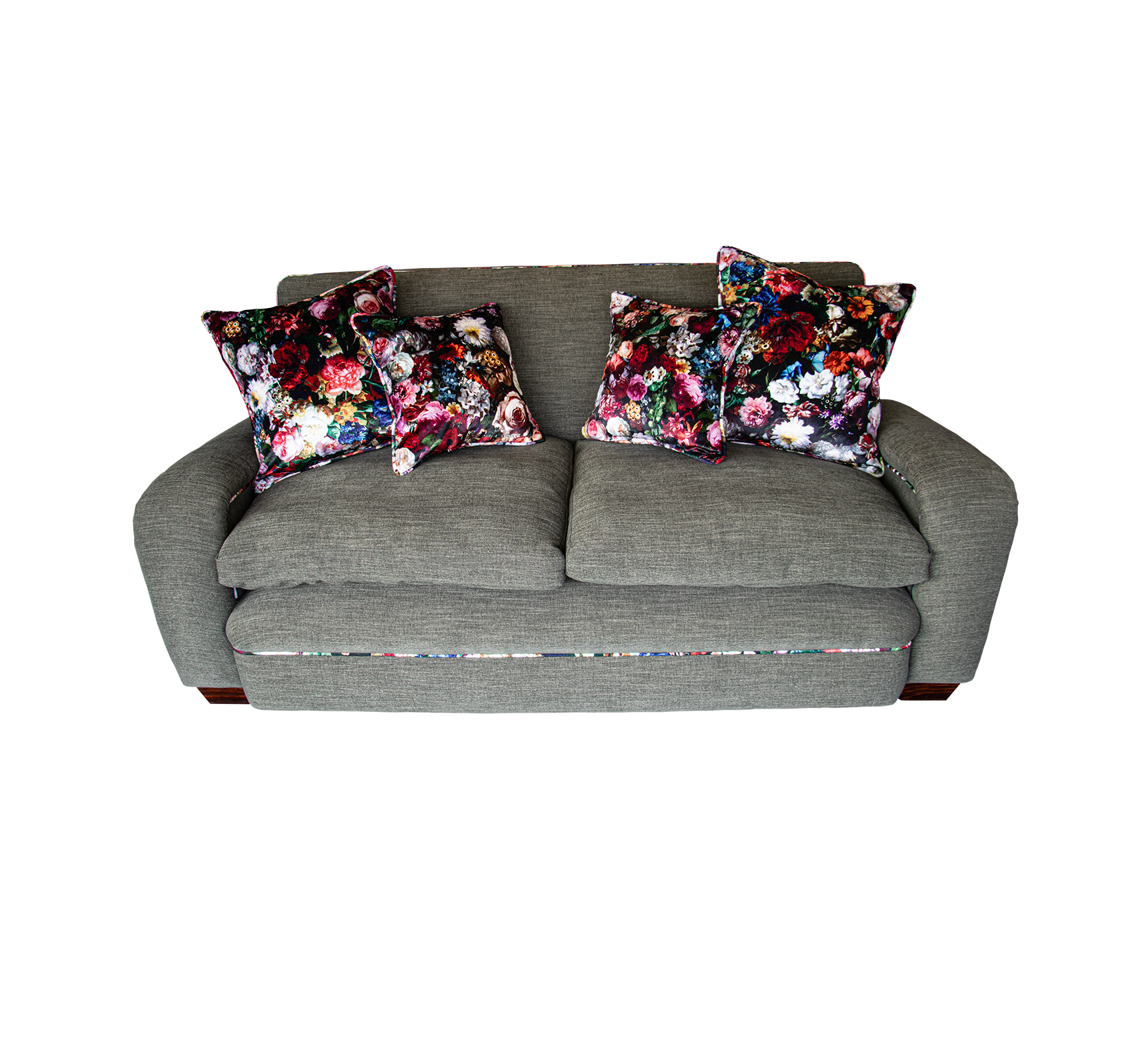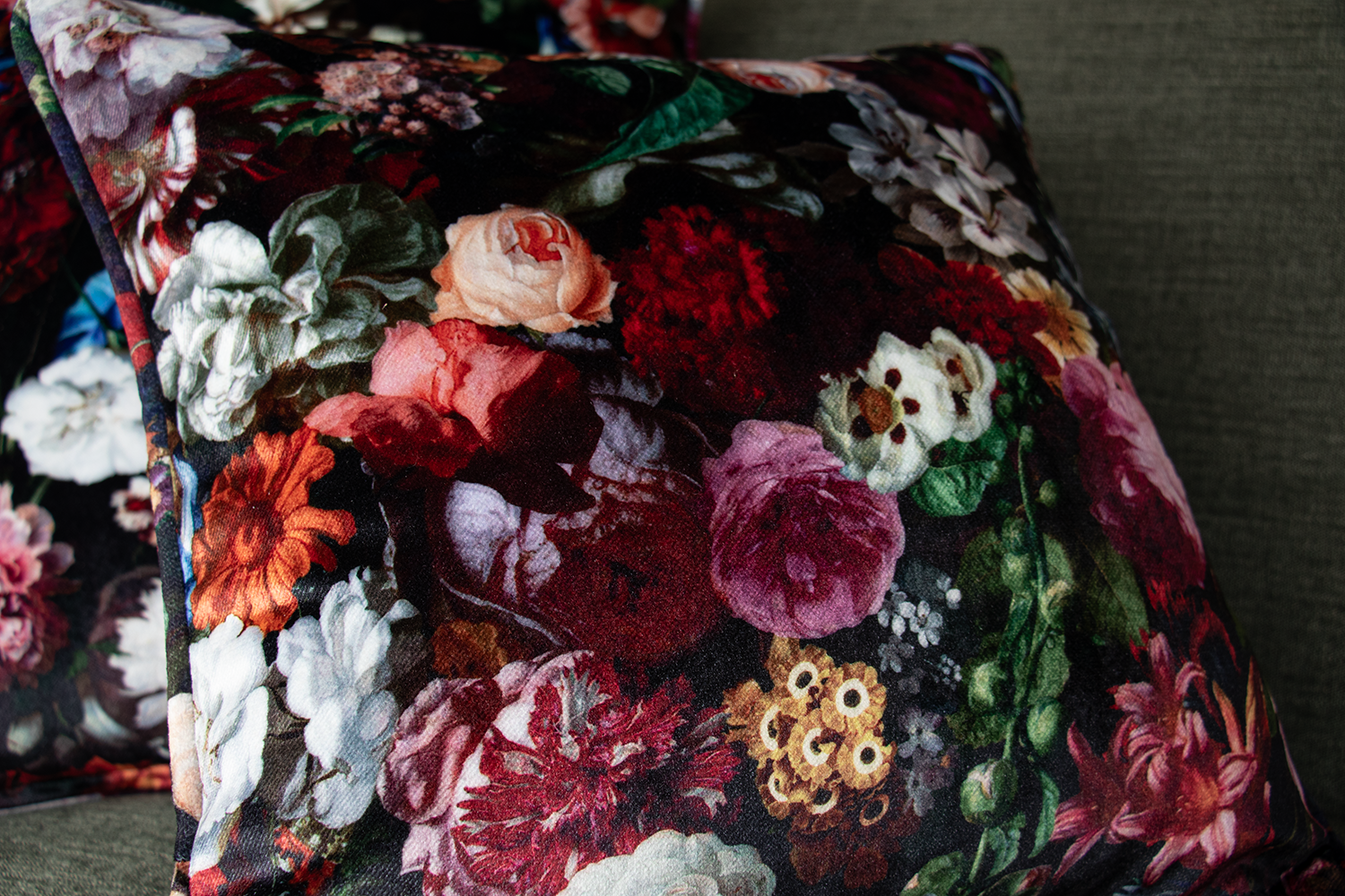 The included scatter cushions are upholstered in Flowerbomb, a heavy-duty floral polyester velvet that adds richness and depth. These cushions are included as part of the suite.